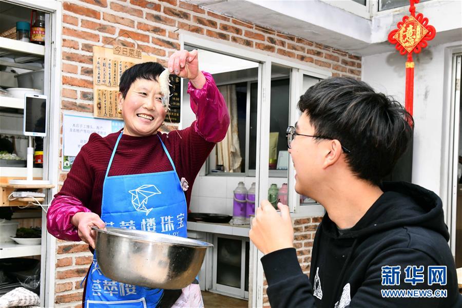 在荣成市烟墩角村,于海洋的母亲向就餐的游客展示食材(1月12日摄)。新华社记者 王凯 摄