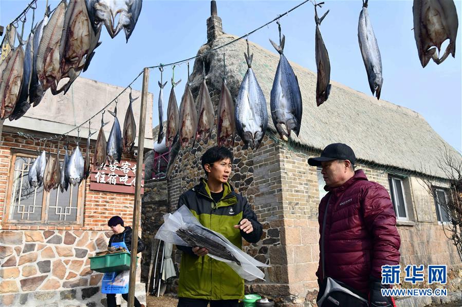 在荣成市烟墩角村,于海洋(中)向游客介绍自家晾晒的鲅鱼(1月12日摄)。新华社记者 郭绪雷 摄