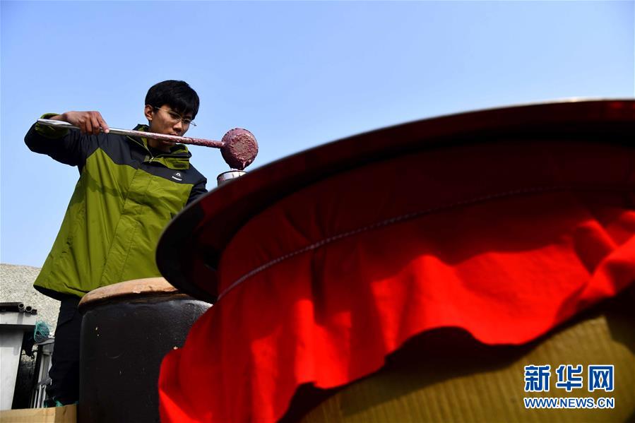 在荣成市烟墩角村,于海洋将虾酱装瓶(1月12日摄)。新华社记者 王凯 摄