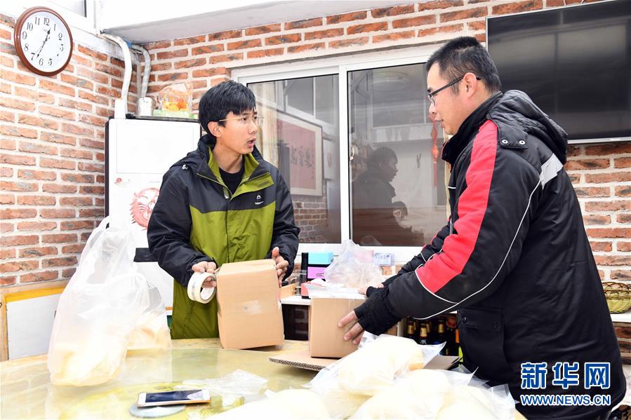在荣成市烟墩角村,于海洋(左)与前来收货的快递小哥交谈(1月12日摄)。新华社记者 王凯 摄