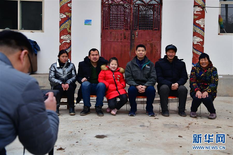 在米村镇拐峪村,郭振伟(右三)和贫困户李长安一家合影(1月14日摄)。新华社记者 冯大鹏 摄