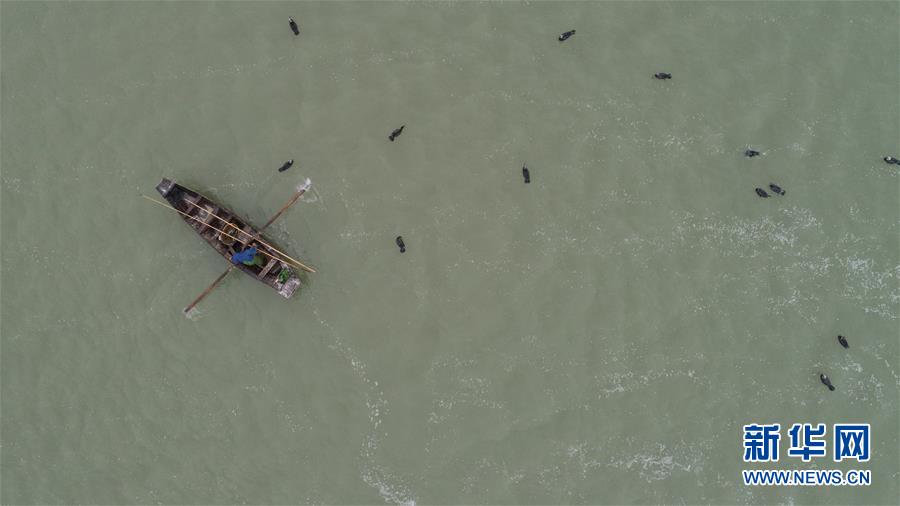 袁国圣在鄱阳湖康山大堤水域用鸬鹚捕鱼(无人机照片,1月9日摄)。新华社记者 余刚 摄