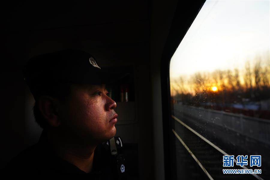 1月14日,陈大伟在列车上凝望窗外的夕阳。新华社记者 邢广利 摄