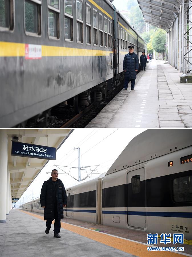 拼版照片上图:川黔线绿皮车停靠在赶水火车站,张维华(前)在列车旁值守(1月13日摄),下图:搭乘渝贵线高铁列车到达赶水东站的张维华正在出站(1月13日摄)。
