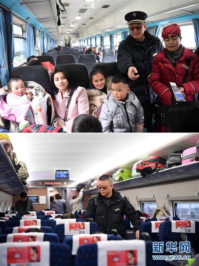 拼版照片上图:张维华(右二)和搭乘川黔线普速列车的旅客聊天(1月13日摄),下图:张维华搭乘渝贵线高铁列车返回老家赶水镇(1月13日摄)。新华社记者 唐奕 摄