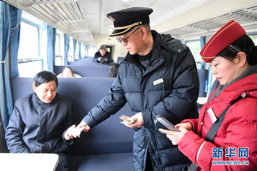 1月13日,张维华(中)和同事在为搭乘川黔线普速列车的旅客提供补票服务。新华社记者 唐奕 摄