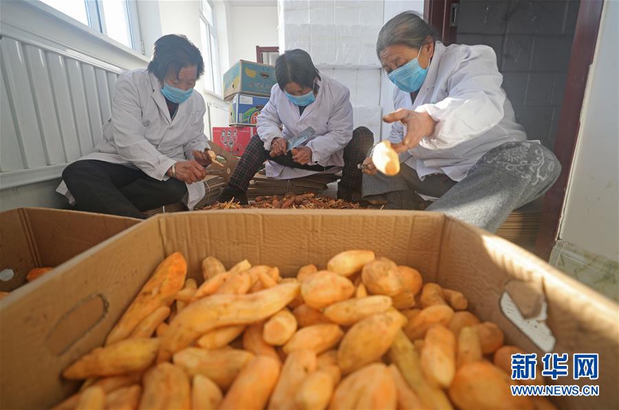 1月16日,在康平县二牛所口镇刘家窝堡村,村民在加工地瓜产品。该村以生产和销售地瓜相关产品作为村民增收的主要产业。 辽宁省沈阳市康平县建立健全脱贫长效机制,继续巩固提升脱贫攻坚成果。康平县通过设立扶贫车间、大力发展设施农业、加工和网络销售特色农产品等多种方式,助力农民脱贫致富。 新华社记者 杨青摄
