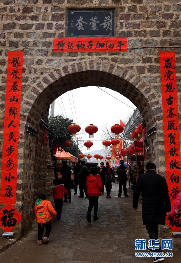 这是1月16日拍摄的葫芦套老街入口。 1月16日,河南省郏县茨芭镇前庄村葫芦套老街举办特色年货集会活动,既有琳琅满目的特色农副产品,又有舞龙舞狮等民俗文艺表演。当晚还举办“话脱贫、感党恩、谋发展”乡村春晚活动,游客与当地村民欢聚一堂,其乐融融。 新华社发(郝源 摄)