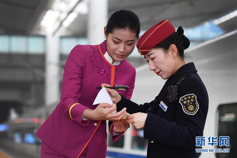 吉如(左)将盲人旅客吴潇护送上车后,与列车长进行交接(1月15日摄)。 新华社记者 陶明 摄