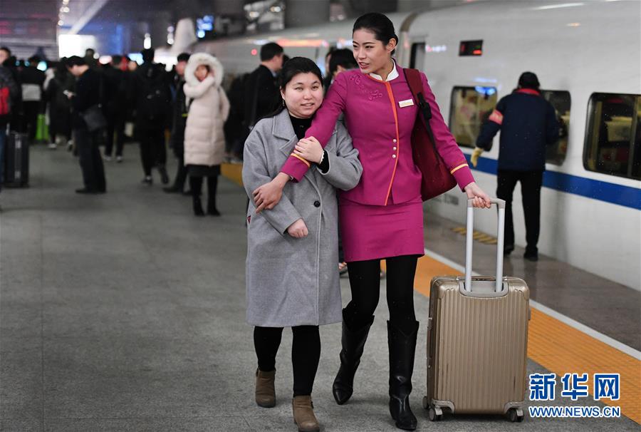 吉如(前右)护送盲人姑娘吴潇上车(1月15日摄)。 新华社记者 陶明 摄