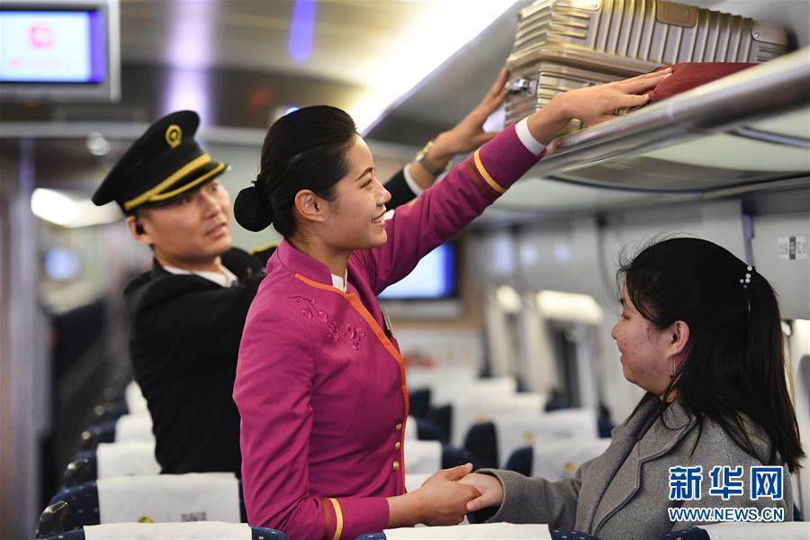 吉如(中)将盲人姑娘吴潇护送上车后,为她安放行李(1月15日摄)。 新华社记者 陶明 摄