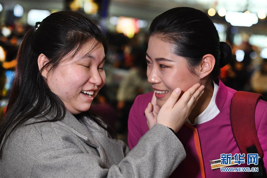 盲人姑娘吴潇(左)从西安北站中转回延安老家,得到吉如的温馨服务。临别时,吴潇激动地说:“小姐姐,你的服务太贴心了,我看不见你,能摸摸你的脸颊吗?”(1月15日摄)。 新华社记者 陶明 摄