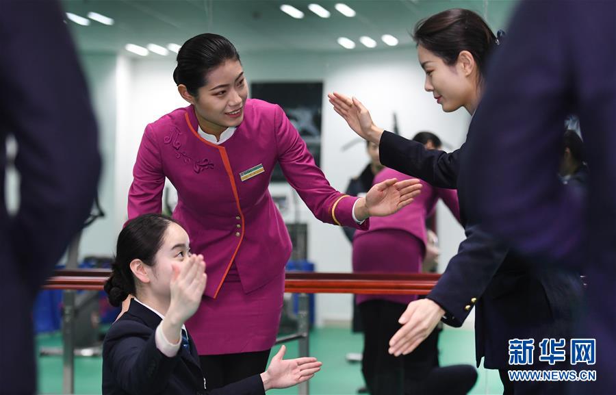 吉如(后左一)在车站职工活动室指导同事礼仪训练(1月15日摄)。 新华社记者 陶明 摄