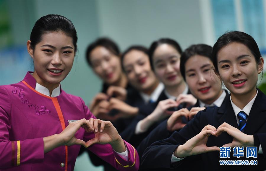 吉如(左一)在车站职工活动室里指导同事礼仪训练(1月15日摄)。 新华社记者 陶明 摄