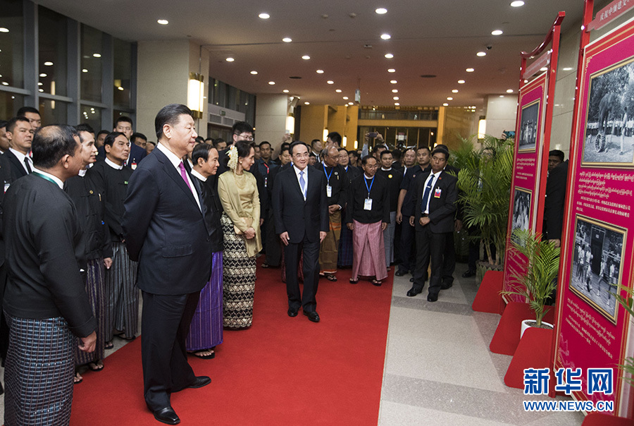 当地时间1月17日晚,国家主席习近平在内比都第二国际会议中心出席中缅建交70周年庆祝活动暨中缅文化旅游年启动仪式。这是仪式开始前,习近平在缅方领导人陪同下,观看庆祝中缅建交70周年图片展。 新华社记者 黄敬文 摄