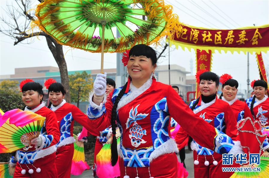 1月17日,演员在江苏省徐州市睢宁县双沟镇举办的踩街巡游活动中表演民俗节目。 春节将至,各地举办丰富多样的民俗活动,迎接新春佳节。 新华社发(洪星 摄)