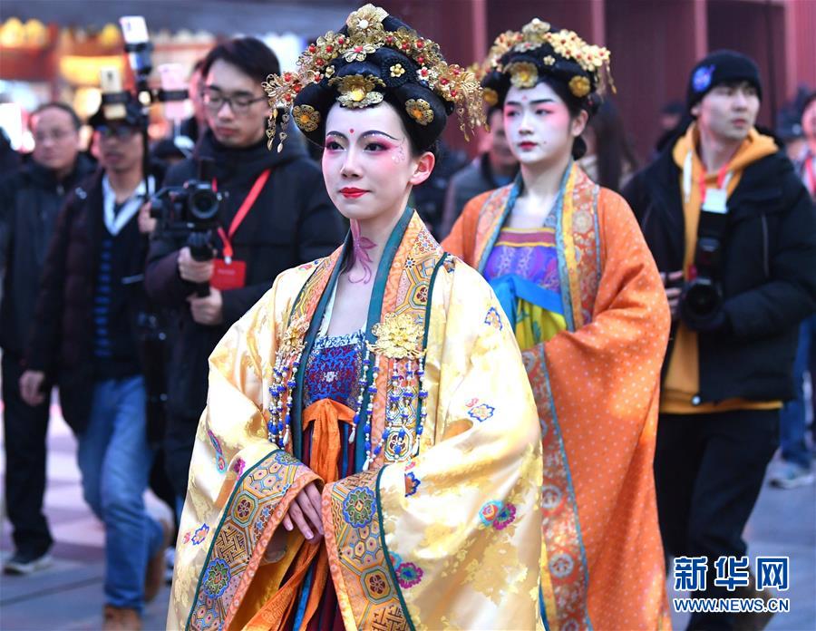 1月17日,演员在西安大唐不夜城进行古装表演。新华社记者 张博文 摄