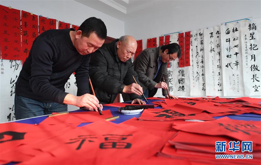 1月18日,河北省河间市曙光社区书法爱好者为居民书写春联和“福”字。