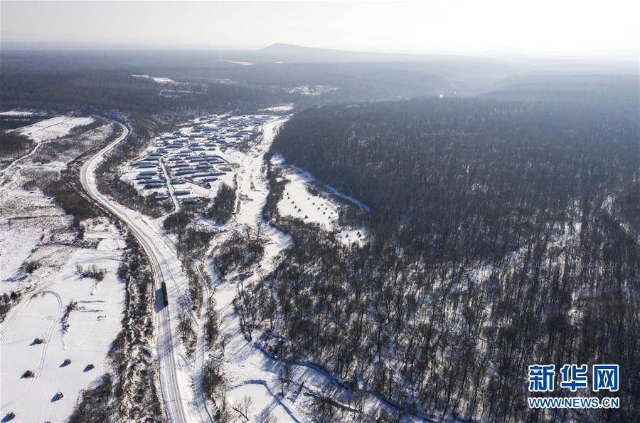 “送水小火车”行驶在林海间,前往送水地点(1月17日摄,无人机照片)。新华社记者 许畅 摄