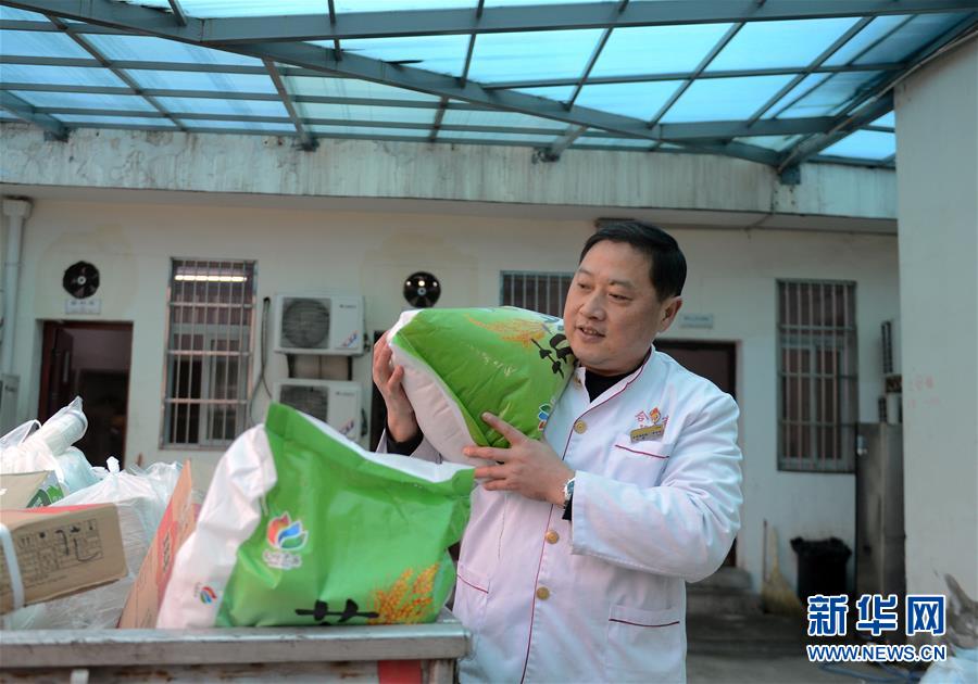 1月17日,李荣军在合肥客运段餐料库搬运大米。 李荣军是中国铁路上海局集团有限公司合肥客运段北京一队二班的餐车厨师,已经工作33年了,目前服务于合肥客运段的多趟旅客列车。每次发车前,李荣军都需要依据乘客情况列出所需的食材量,然后从餐料库配送到车上。在餐车里,李荣军平均一天要加工80斤左右的蔬菜和40斤肉类,春运期间乘客增多,他的工作强度也变得更大。在这个亿万人踏上回家之旅的时刻,像李荣军一样的餐车大厨们坚守岗位,用“春运味道”温暖着一批又一批的归乡人。 新华社记者 韩晓雨 摄