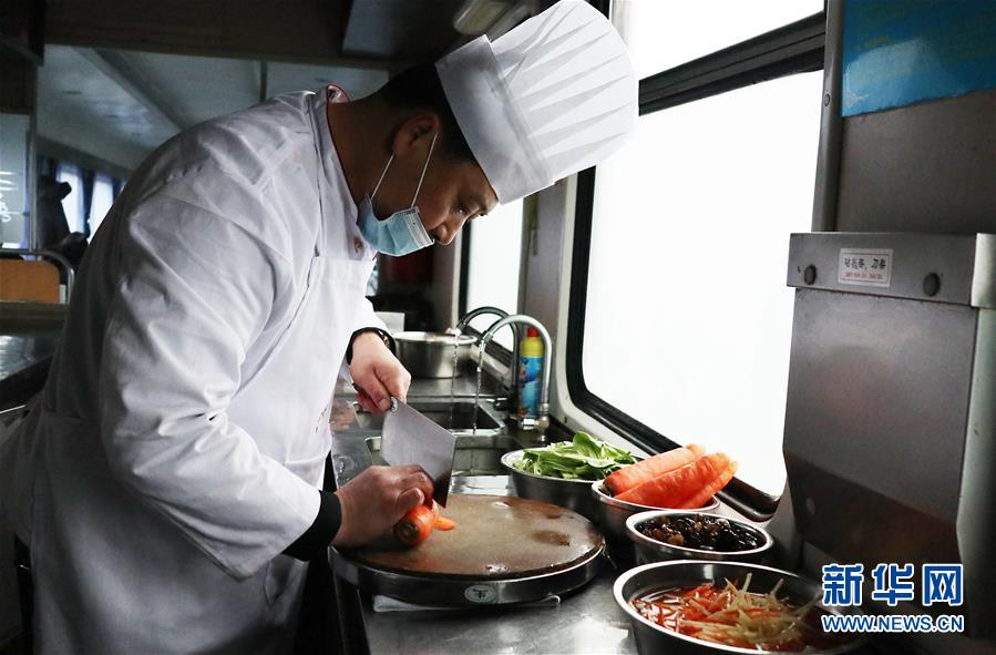 1月17日,李荣军(右一)与同事一起把食材拎上车。 李荣军是中国铁路上海局集团有限公司合肥客运段北京一队二班的餐车厨师,已经工作33年了,目前服务于合肥客运段的多趟旅客列车。每次发车前,李荣军都需要依据乘客情况列出所需的食材量,然后从餐料库配送到车上。在餐车里,李荣军平均一天要加工80斤左右的蔬菜和40斤肉类,春运期间乘客增多,他的工作强度也变得更大。在这个亿万人踏上回家之旅的时刻,像李荣军一样的餐车大厨们坚守岗位,用“春运味道”温暖着一批又一批的归乡人。 新华社记者 韩晓雨 摄