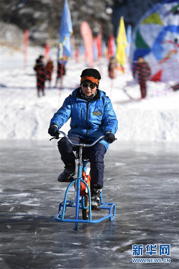 1月18日,游客在新疆天池景区玩冰上自行车。新华社记者 沙达提 摄