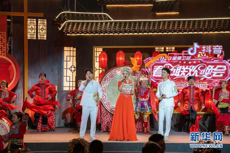 1月18日,在湖南省湘西土家族苗族自治州花垣县十八洞村,演员在演唱歌曲。 1月18日,2020湖南卫视“奋斗奔小康,幸福过大年”春节联欢晚会分会场活动在湘西土家族苗族自治州花垣县十八洞村举行,演员与村民一起欢度团圆夜,喜迎中国年。 新华社发(陈思汗 摄)