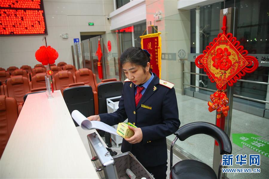 1月18日,王娟娟在检票口清点医药箱中的药品。新华社记者 龙雷 摄