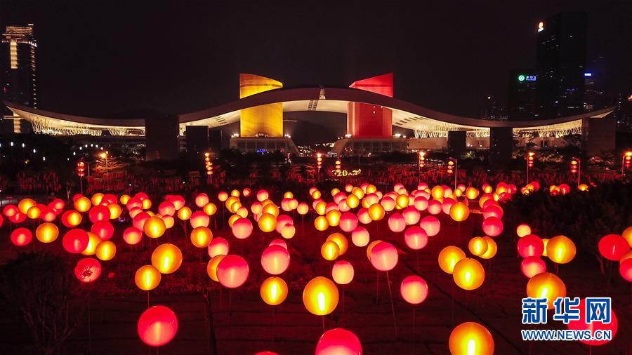这是1月19日在深圳市民中心前拍摄的彩灯(无人机照片)。 近日,深圳市城市管理和综合执法局在城市道路灯杆、天桥和行道树上悬挂节庆灯笼,并在深南大道等重要区域设置迎春灯光小品,迎接即将到来的2020年新春佳节。 新华社记者毛思倩摄