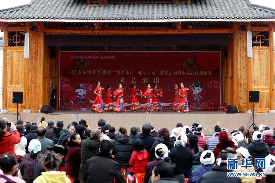 1月20日,在柳州市三江侗族自治县易地扶贫搬迁安置点古宜镇南站社区,搬迁群众在观看文艺表演。 当日,广西柳州市三江侗族自治县易地扶贫搬迁安置点古宜镇南站社区开展“安居乐业·暖心行动”迎新春系列活动,社区搬迁户通过开展百家宴、芦笙踩堂舞、文艺表演等丰富多彩的民俗活动,喜迎即将到来的新春佳节。 新华社发(吴练勋 摄)