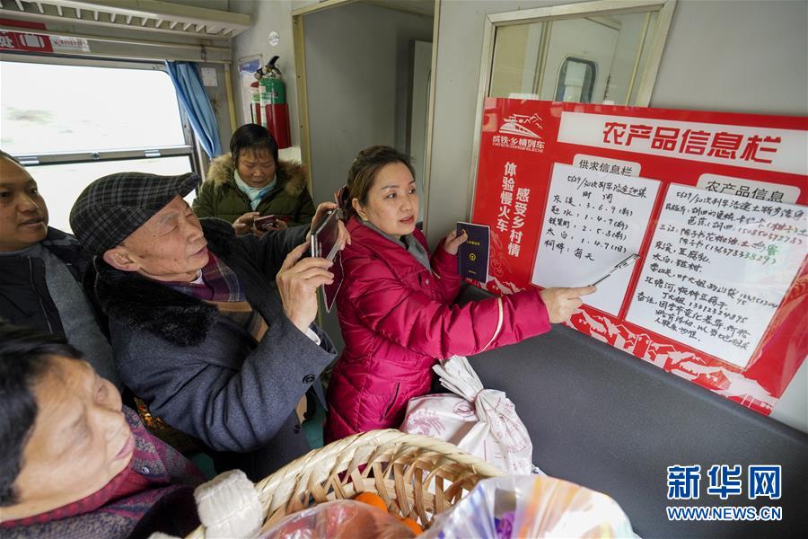 1月20日,在5629次列车上,列车广播员杜晓霞(右一)利用工作间隙在车厢里给前来咨询的旅客介绍农产品信息栏里当日重点推介的农产品。新华社记者 刘潺 摄