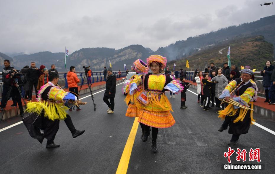1月21日,四川叙永,民众跳舞庆贺大桥建成通车。当日,位于川滇黔交界处的鸡鸣三省大桥建成通车。中新社记者 刘忠俊 摄