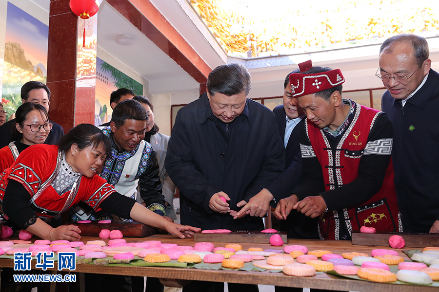 1月19日至21日,中共中央总书记、国家主席、中央军委主席习近平来到云南,看望慰问各族干部群众,向全国人民致以新春祝福。这是19日下午,习近平在腾冲市清水乡三家村中寨司莫拉佤族村,同村民李发顺一家制作当地节日传统食品大米粑粑。 新华社记者 鞠鹏 摄