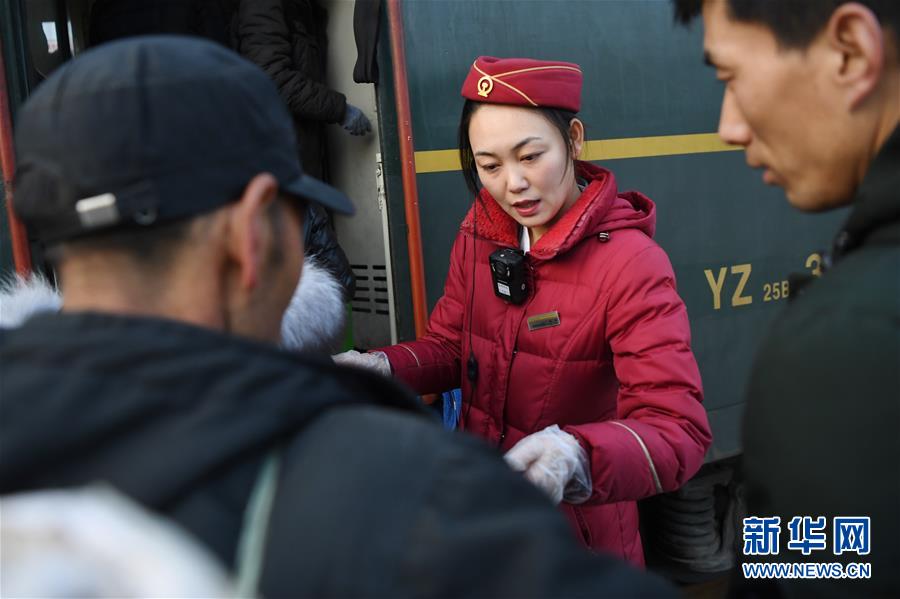 1月21日,列车员赵欣在7504/3次列车车门处检票引导旅客上车。 新华社记者 陈斌 摄