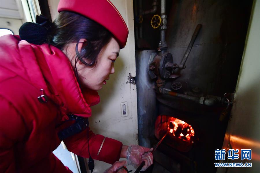 1月21日,列车员赵欣在7504/3次列车上烧锅炉。 新华社记者 陈斌 摄