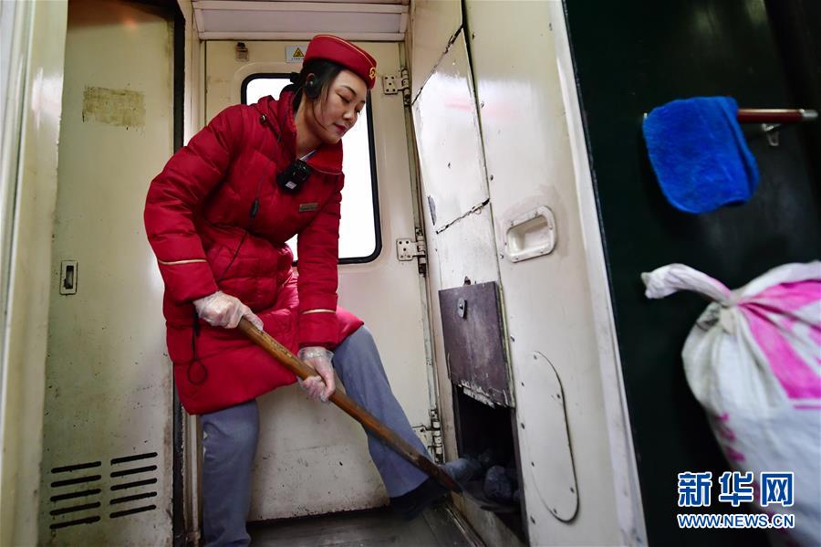 1月21日,列车员赵欣在7504/3次列车上准备给锅炉加煤。 新华社记者 陈斌 摄