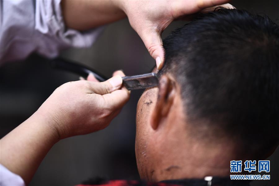 1月21日,在台江县光明理发店,理发师王孔武为顾客修面。新华社发(欧阳光林 摄)