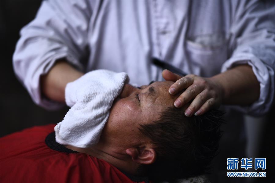 1月21日,在台江县光明理发店,理发师王孔武为顾客修面。 新华社发(欧阳光林 摄)