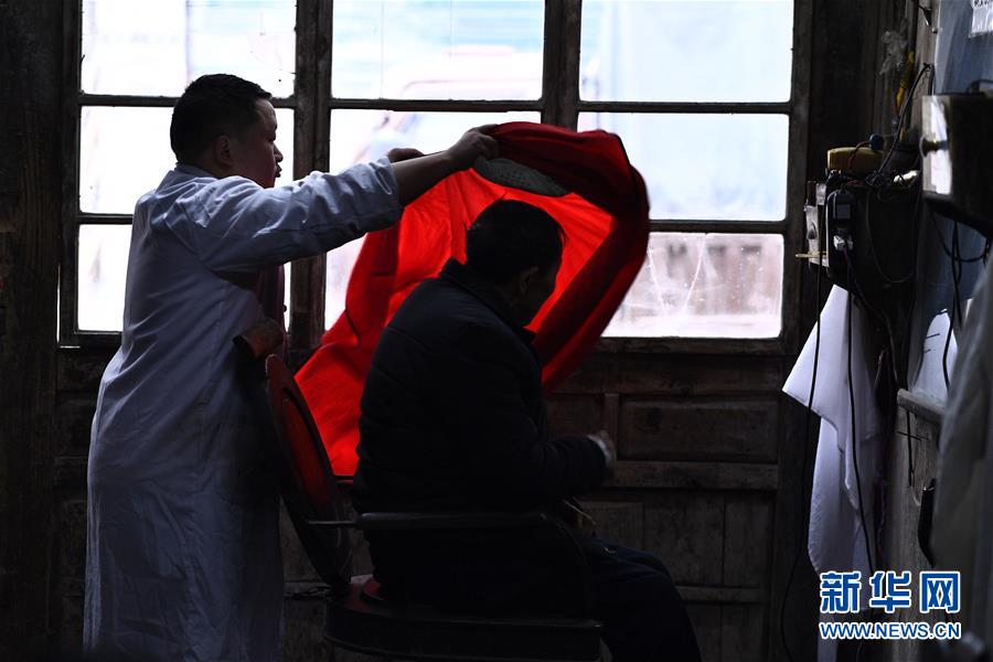 1月21日,在台江县光明理发店,理发师王孔武准备为顾客理发。新华社发(欧阳光林 摄)