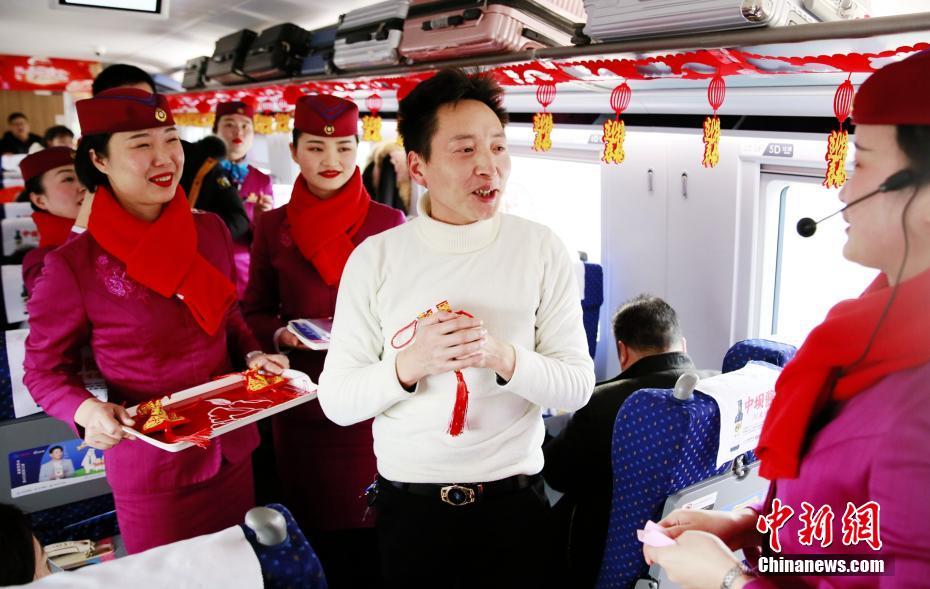 1月21日,在成都东开往贵阳北的C5973次列车上,为让旅客在春运中感受到春节氛围,中国铁路成都局集团有限公司成都客运段列车工作人员为旅客准备了一场喜庆热闹的“列车春晚”活动,为旅客送去新春祝福。图为动妹”们邀请旅客抽选福袋回答字谜,并为旅客们送上春联、福字等春节小礼品。陶静 摄