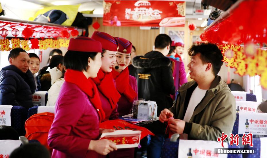 1月21日,在成都东开往贵阳北的C5973次列车上,为让旅客在春运中感受到春节氛围,中国铁路成都局集团有限公司成都客运段列车工作人员为旅客准备了一场喜庆热闹的“列车春晚”活动,为旅客送去新春祝福。图为“动妹”们邀请旅客抽选福袋回答字谜,并为旅客们送上春联、福字等春节小礼品。陶静 摄