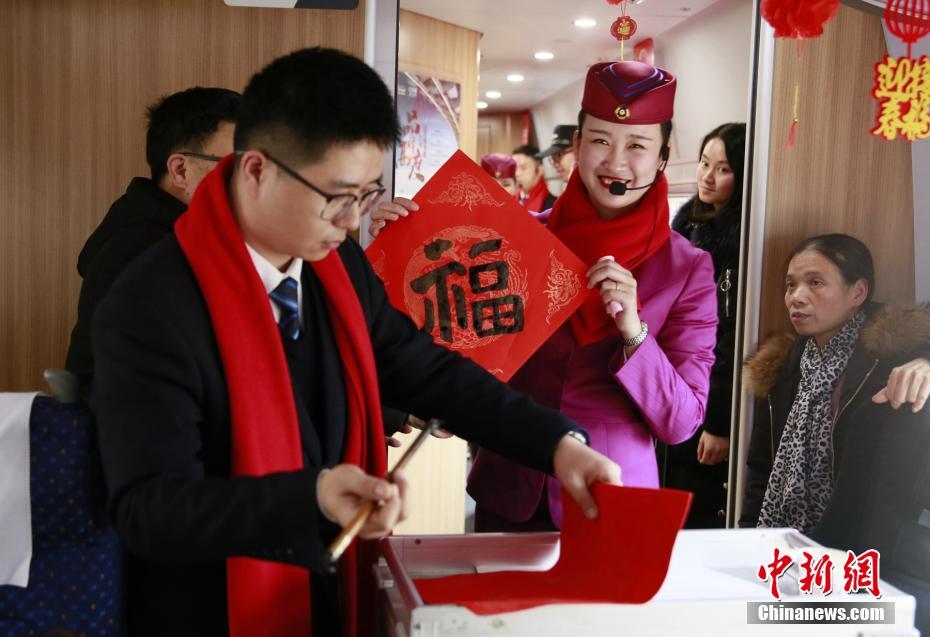 1月21日,在成都东开往贵阳北的C5973次列车上,为让旅客在春运中感受到春节氛围,中国铁路成都局集团有限公司成都客运段列车工作人员为旅客准备了一场喜庆热闹的“列车春晚”活动,为旅客送去新春祝福。图为列车工作人员现场写“福”字送给车厢内的旅客。陶静 摄