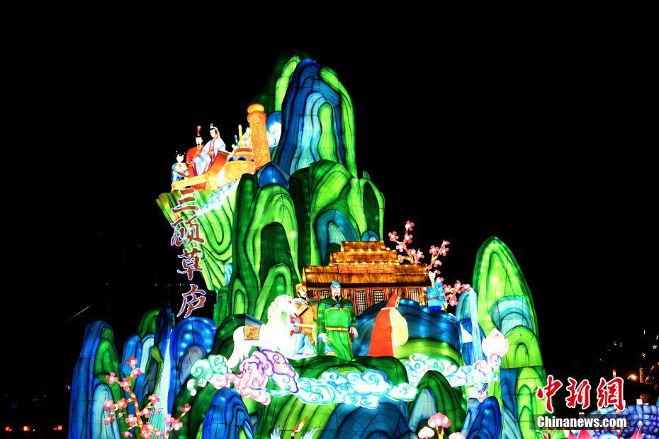 西区广场和轴线两大灯组分别以“喜神送宝”和“魅力天府”为主题,将生肖鼠和红包、祥云、银杏等吉祥元素相结合,营造温馨、浪漫和喜庆的节日氛围,呈现出吉庆祥和、物丰民富、前程似锦的魅力天府景象。图为“三顾草庐”大型灯组。安源 摄