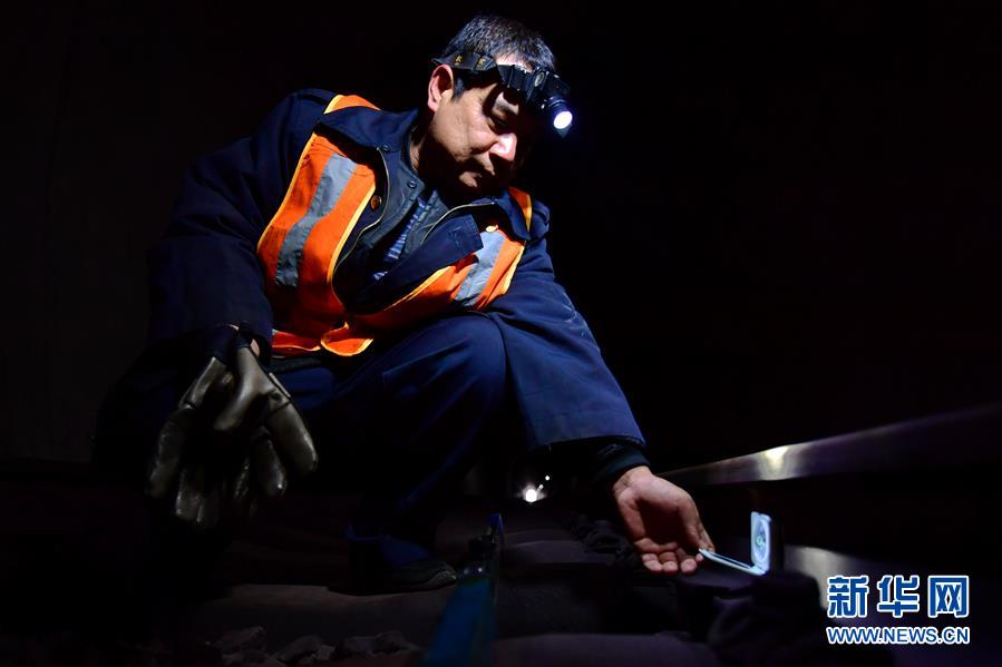 1月21日,太原工务段柳林河值守点线路工李三保在测量轨温。新华社记者 曹阳 摄