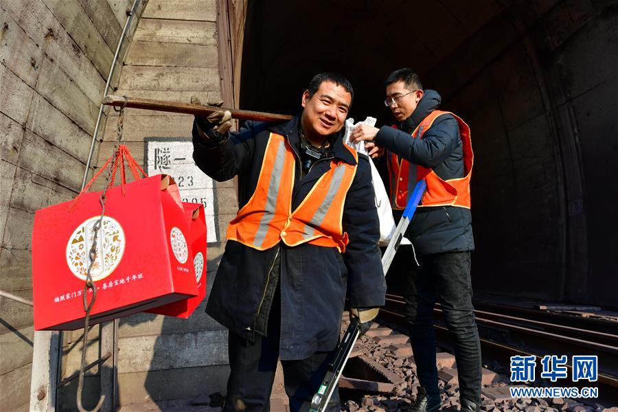 1月21日,工友在帮太原工务段柳林河值守点线路工李三保(左)将年货固定在扁担上。新华社记者 曹阳 摄