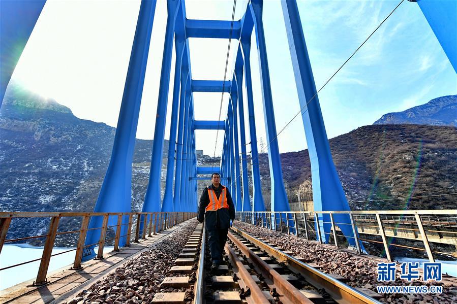 1月21日,太原工务段柳林河值守点线路工李三保在巡线路上。新华社记者 曹阳 摄
