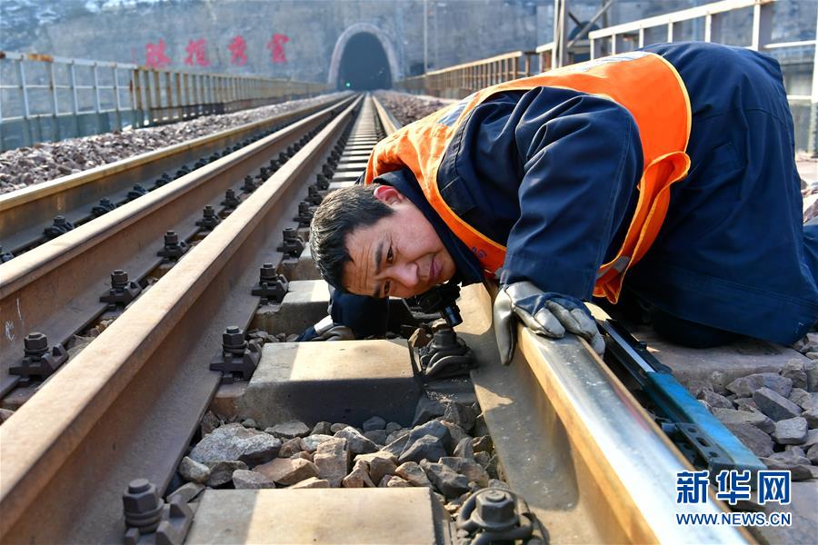 1月21日,太原工务段柳林河值守点线路工李三保在检查轨道的高低状态。新华社记者 曹阳 摄