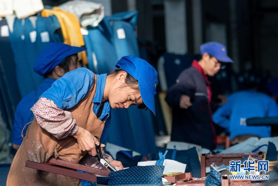 梁桂枝在车间裁剪布料(2019年11月6日摄)。新华社发(袁艺华摄)
