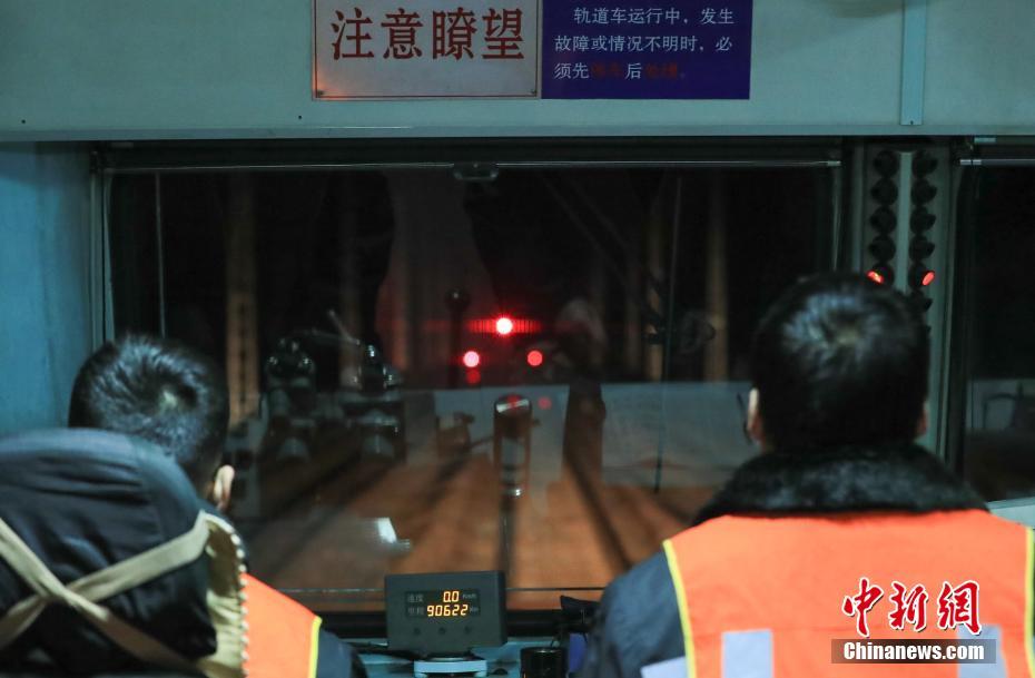 1月14日,工人驾驶轨道车进入隧道。中新社记者 贾天勇 摄