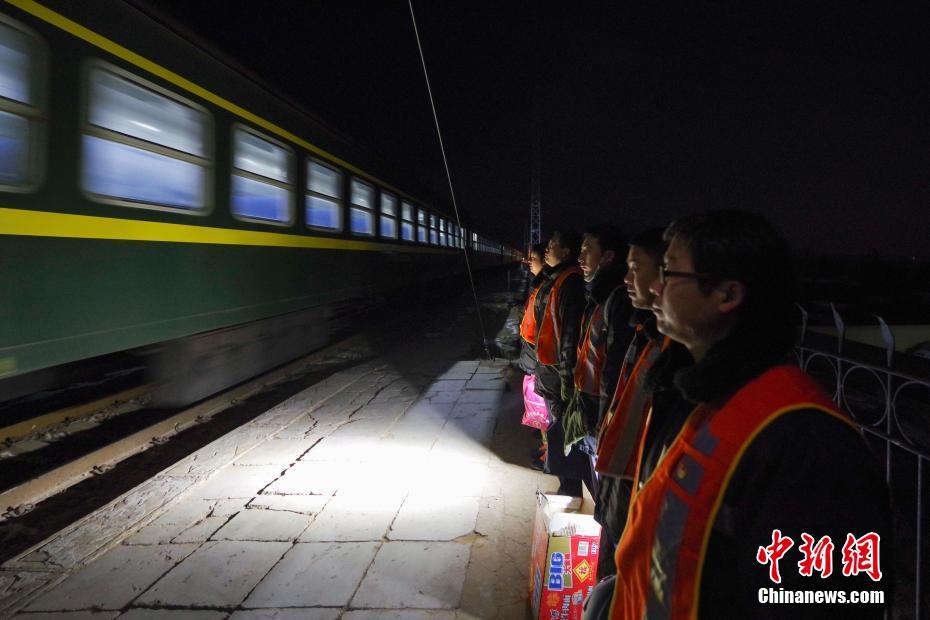 1月14日早6时,打冰工人列队等候列车经过后上线作业。中新社记者 贾天勇 摄